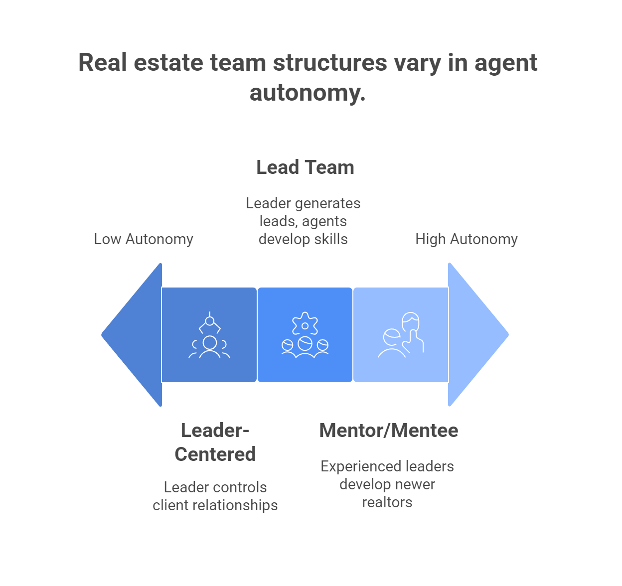 The leader-centered structure revolves around one experienced agent who manages client relationships and closes deals. Everyone else handles support—showings, admin, marketing.
